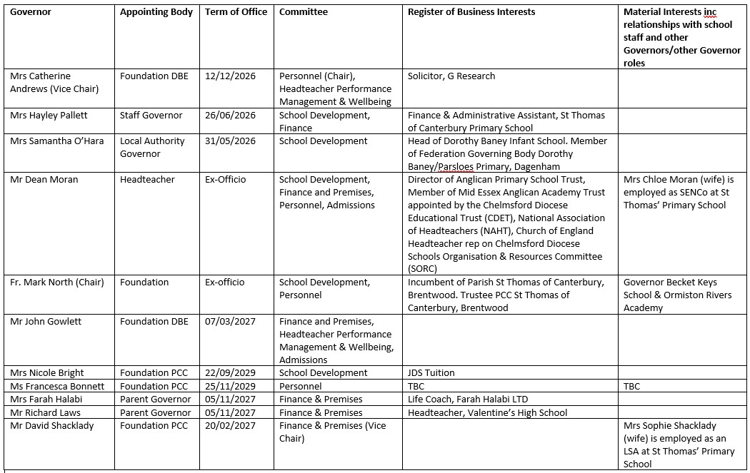 The Governing Body of St Thomas of Canterbury Church of England Primary School comprises of 12 Governors: 2 Parent Governors, 1 Local Authority Governor, 1 Staff Governor and 7 Foundation Governors (3 appointed by the Diocesan Board of Education, 3 by the Parochial Church Council of St Thomas of Canterbury, Brentwood and 1 ex-Officio). The Headteacher is also a Governor (ex-officio).